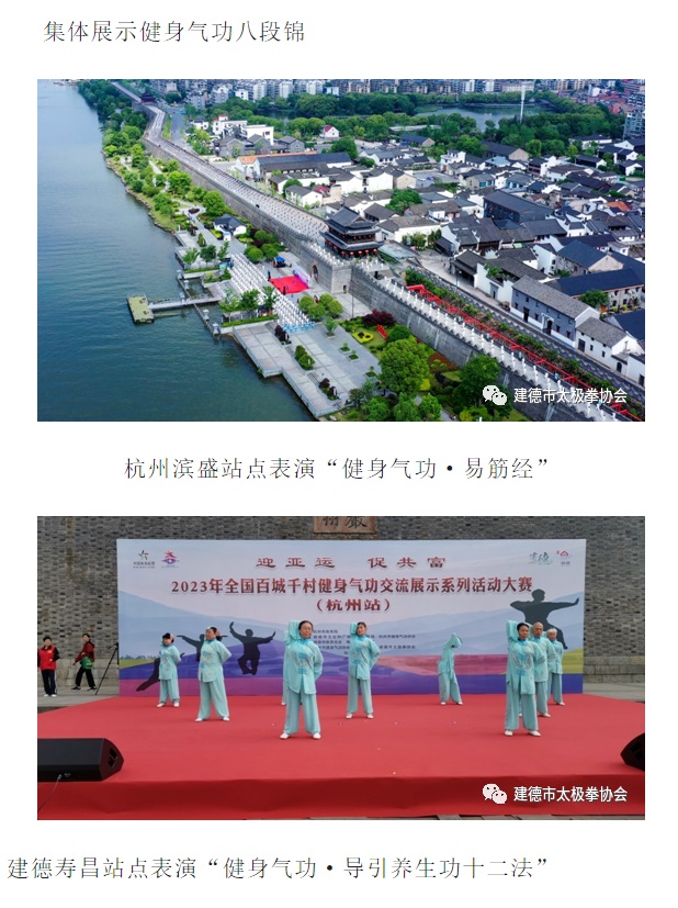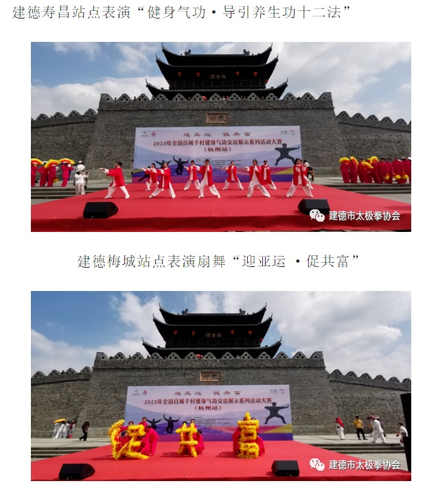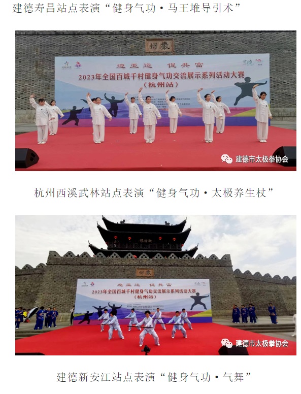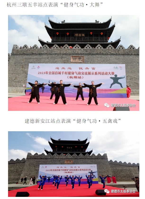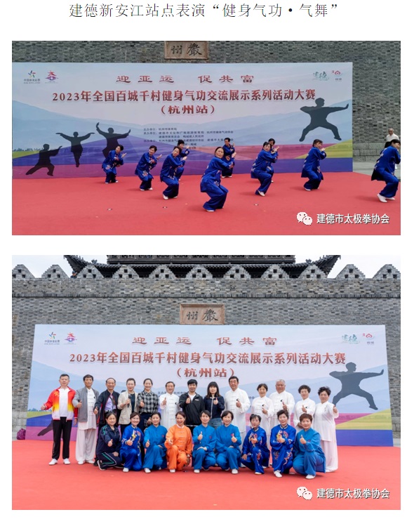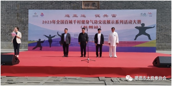 5月8日,在千年古城建德市梅城镇澄清门外,由杭州市体育局主办,杭州市健身气功协会、建德市文化和广电旅游体育局、建德市体育总会、梅城镇人民政府承办,杭州市健身气功协会建德培训总站、建德市太极拳协会协办的“2023年全国百城千村健身气功交流展示系列活动大赛(杭州站)”隆重举行。